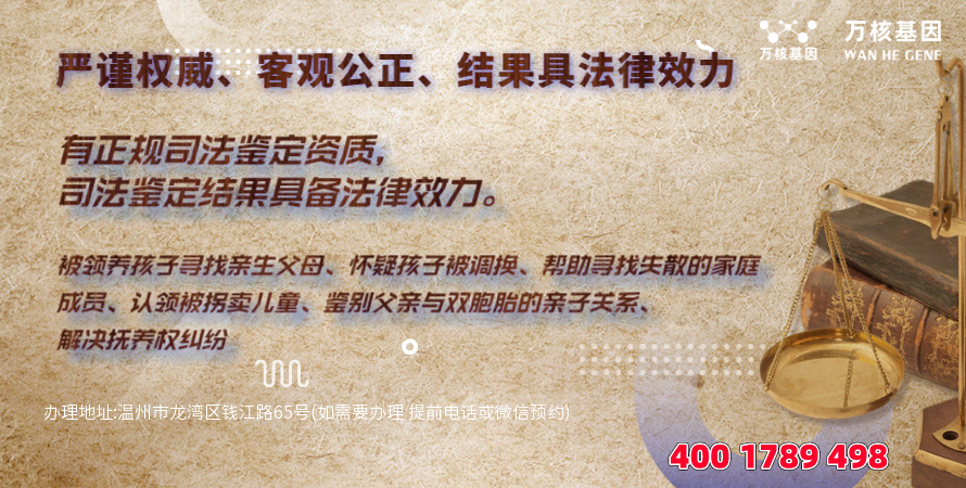在温州龙湾,可快速办理:亲子司法鉴定、亲子关系鉴定、亲缘关系鉴定、个体识别鉴定等等亲子鉴定,温州龙湾亲子司法鉴定办理地址:温州市龙湾区钱江路65号(如需要办理 提前电话或微信预约)-预约电话:4001789498。